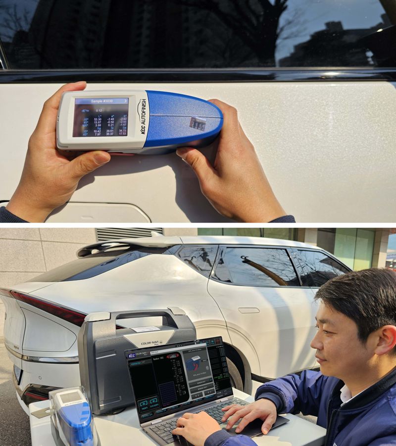 KCC 직원이 칼라나비플러스로 자동차 외장을 측색한 뒤 데이터를 확인하고 있다. KCC 제공