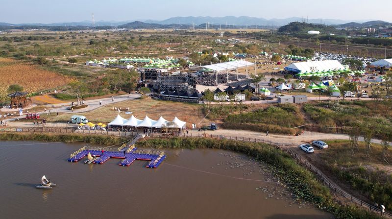 전남 나주시가 오는 17일 오후 5시 영산강 정원 내 호소부, 웅덩이 일원에서 수질 개선과 모기 유충 제거 효과가 있는 미꾸라지 방사 행사를 개최한다. 사진은 지난해 나주영산강축제 당시 설치 운영했던 수상 보행교와 정원 내 호소부 모습. 나주시 제공