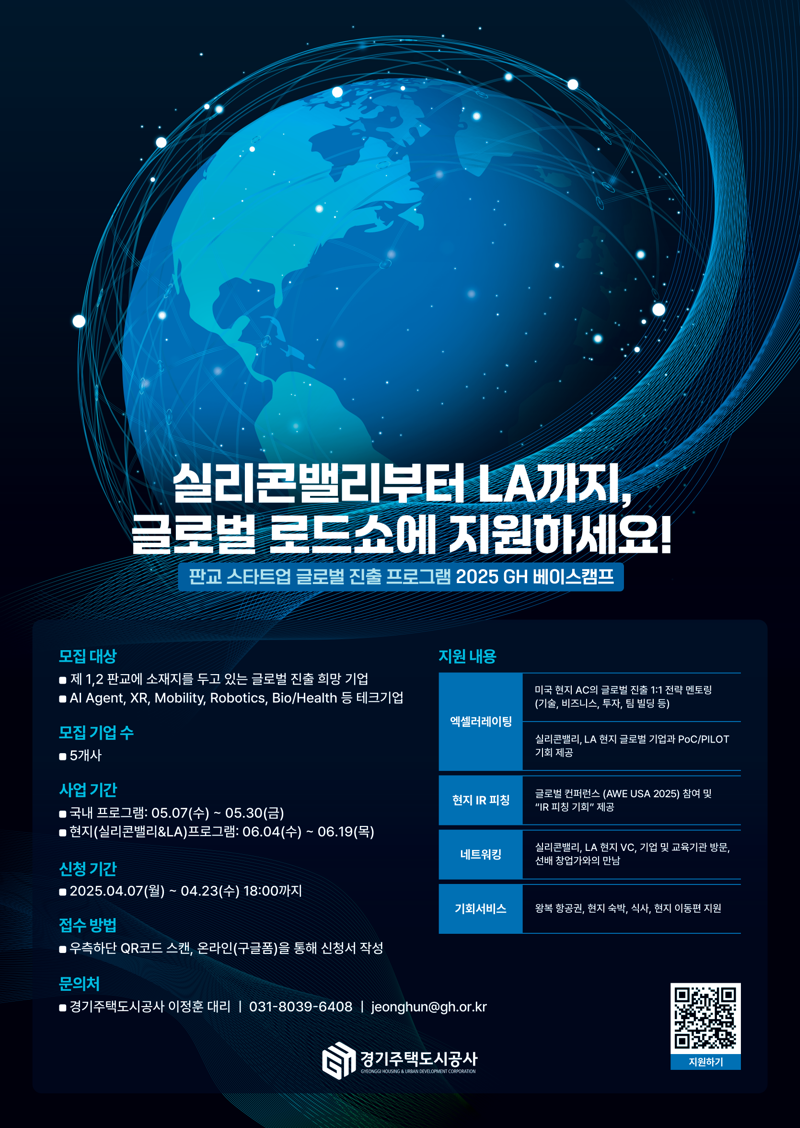 GH는 판교 제1,2 테크노밸리에 소재지를 두고 있는 인공지능(AI), 확장현실(XR), 모빌리티, 로보틱스, 바이오 등 분야의 테크기업을 대상으로 최종 5개사를 선발할 계획이다.