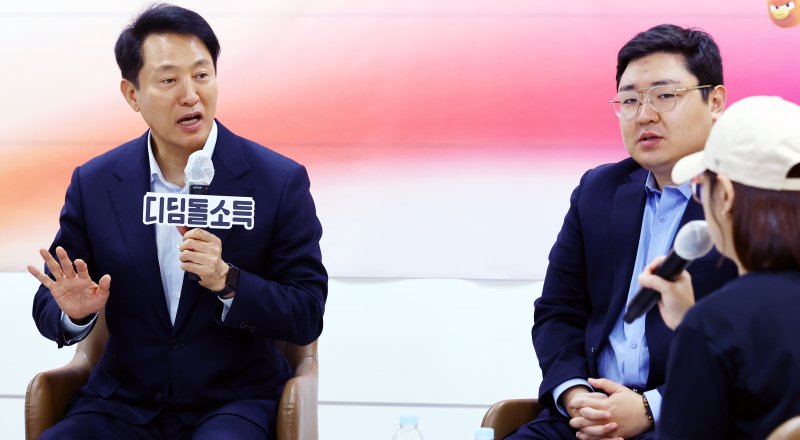 오세훈 서울시장(왼쪽)이 10일 서울시 복지재단에서 열린 '디딤돌소득 간담회'에서 참석자의 질문에 답하고 있다. 뉴시스