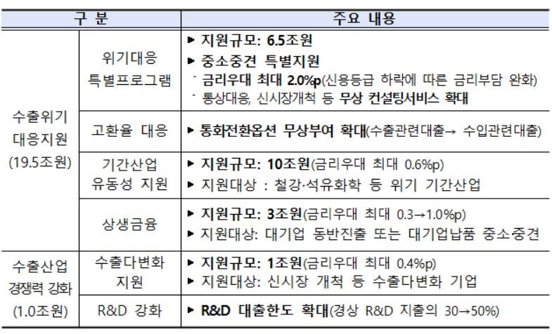 신시장 개척 등 수출 다변화를 추진하는 기업에 1조원을 지원하고, 연구·개발(R&D) 관련 대출 한도를 최근 3년 평균 경상 R&D 지출의 30%에서 50%로 확대한다.