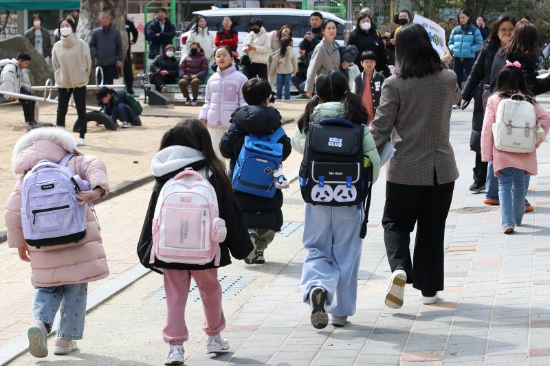 (대구=뉴스1) 공정식 기자 = 17일 오후 대구의 한 초등학교에서 학생들이 교사의 귀가 지도에 따라 하교를 준비하고 있다. 교문 주변은 자녀를 기다리는 학부모와 보호자로 북적이고 있다. 2025.3.17/뉴스1 /사진=뉴스1화상