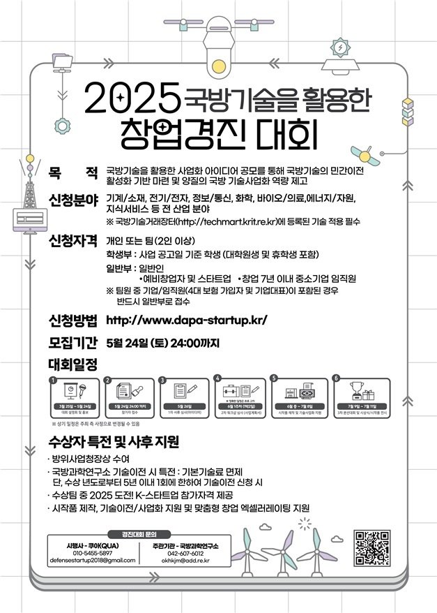 방위사업청이 '2025 국방기술을 활용한 창업경진대회' 참가자를 5월 24일까지 공개모집한다.