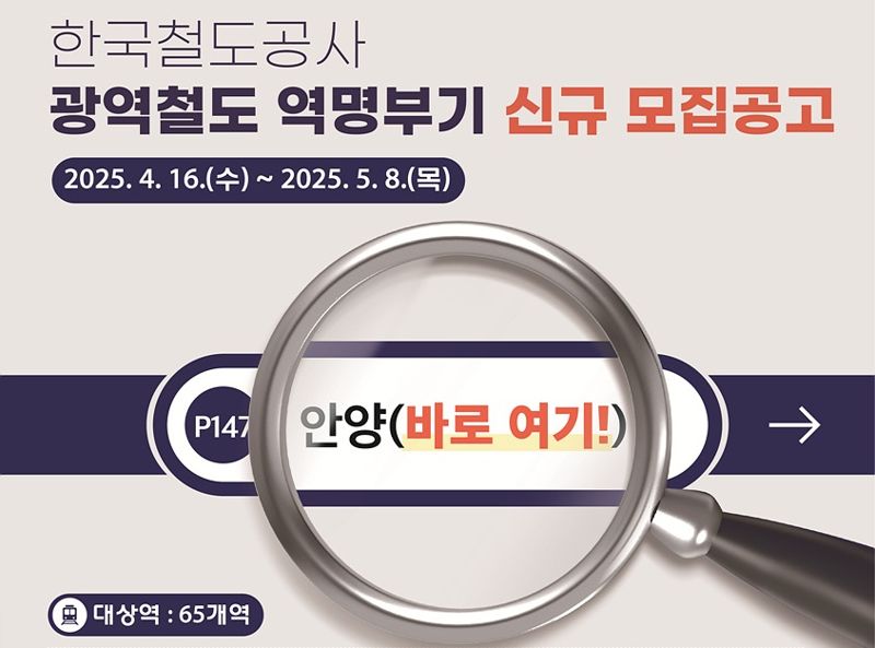 [파이낸셜뉴스] 한국철도공사(코레일)가 오는 5월 8일까지 65개 수도권전철역을 대상으로 역명부기 사용기관을 모집한다고 15일 밝혔다.