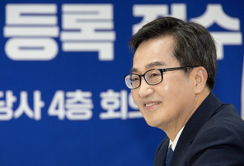 제21대 대통령선거에 출마를 선언한 김동연 경기도지사가 15일 오후 서울 여의도 더불어민주당 당사에 마련된 (예비)후보자 등록 접수처를 찾아 서류를 접수하고 있다. 사진=뉴스1