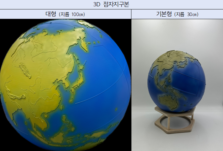 3D 점자 지구본은 국내 최초로 3D 모델링을 통해 세계 대륙과 해안 경계, 날짜변경선, 경도·위도, 북극점·남극점 등 세계지리 교육에 필요한 주요 정보를 입체적으로 표현했다. 시각장애 학생이 촉각을 통해 직관적으로 지구의 형상을 이해할 수 있도록 했다.