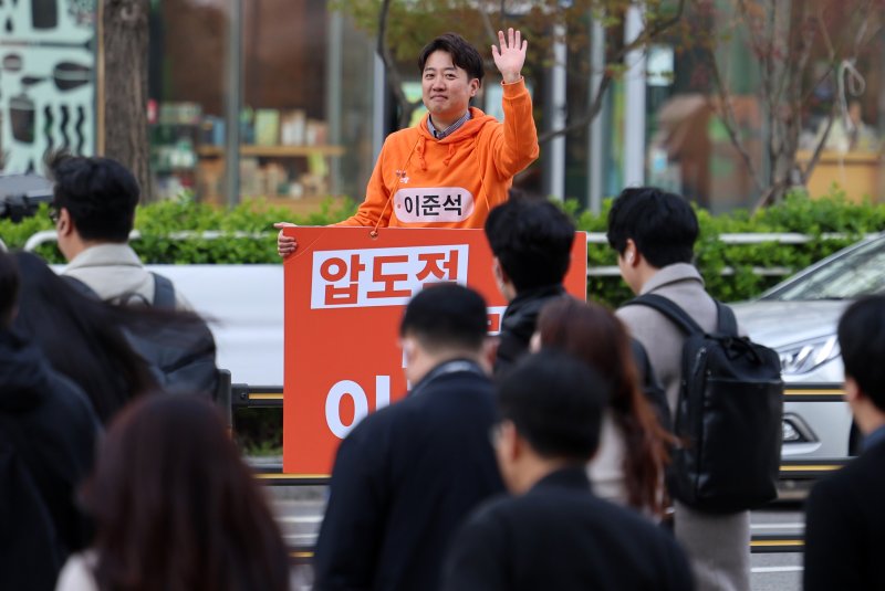 이준석 개혁신당 대선 후보가 16일 오전 서울 금천구 가산디지털단지역 인근에서 출근길 인사를 하고 있다. 뉴시스