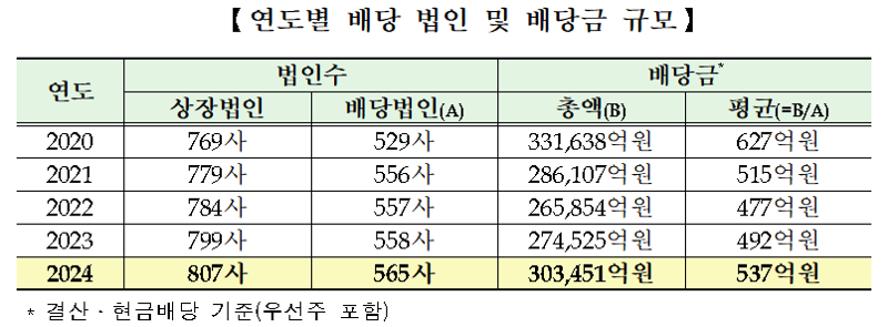 16일 한국거래소는 '유가증권시장 현금배당 법인의 시가배당률, 배당성향 및 주가등락률 현황'을 통해 이같이 밝혔다. 지난해 배당법인사는 565개사로 전년 대비 7개사 늘었다. 같은 기간 상장법인이 799개사에서 807사로 8개사 늘어난 가운데서다. 총 배당금은 3년 연속 증가세를 이어가고 있다.