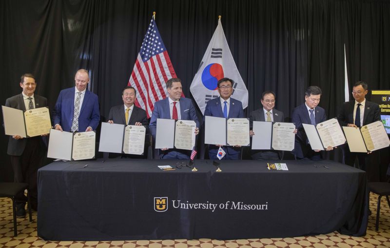 한국원자력연구원·현대엔지니어링·MPR 컨소시엄 컨소시엄이 美 미주리대 차세대연구로 초기설계 계약을 체결한 후 기념 촬영하고 있는 모습. 한국원자력연구원 제공
