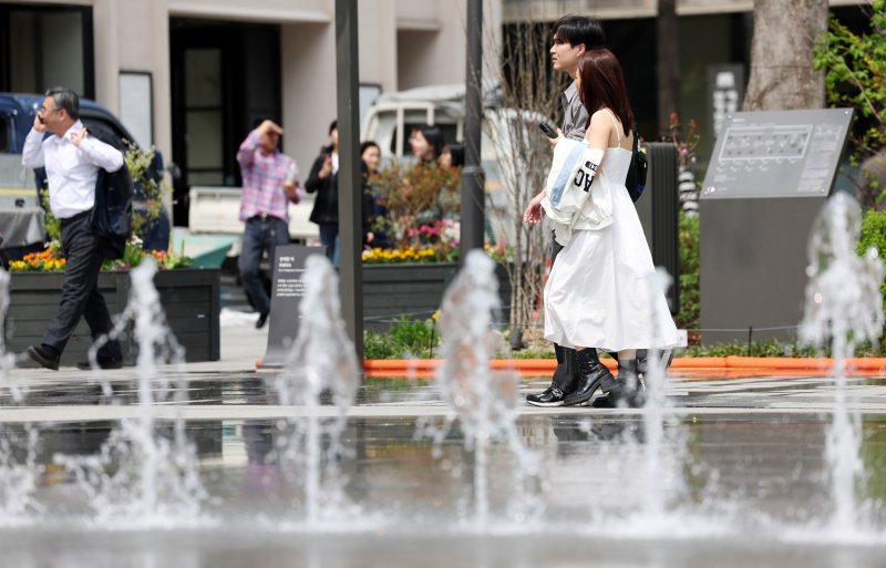 서울의 낮 최고 기온 24도까지 오른 17일 오후 서울 종로구 광화문광장 분수대 앞에서 시민들이 걸어가고 있다. 뉴시스