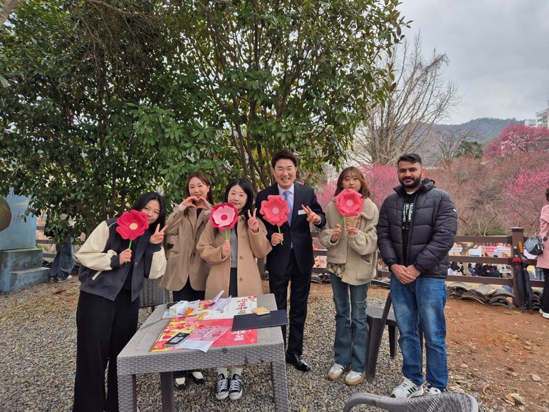 전남 순천시가 지역 마을을 거점으로 한 새로운 체류형 관광 브랜드 '순천마을스테이' 사업을 본격 추진한다. 사진은 노관규 순천시장(오른쪽에서 세 번째)이 지난 3월 순천시를 홍보하기 위해 매곡동 탐매축제 현장을 방문한 순천시 청춘여행길잡이들과 기념촬영을 하고 있는 모습. 순천시 제공