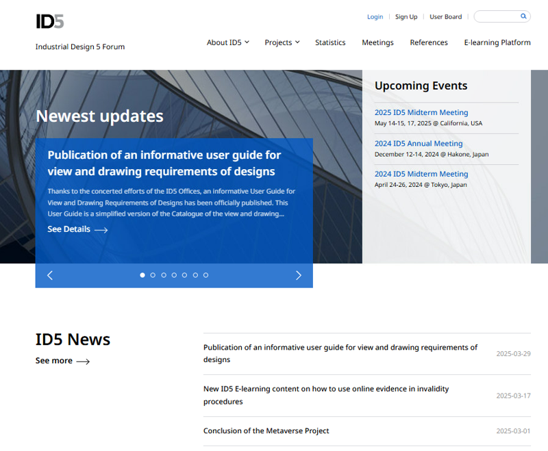 ID5는 디자인 분야의 선진 5개국 협의체(한국·미국·일본·중국·유럽)로, 지난 2016년 출범 이후 30여 개의 협력과제를 꾸준히 수행해 오고 있다. 또한, 그 결과물들은 ID5 공식 홈페이지를 통해 전 세계 사용자들에게 공개, 사용자 친화적인 디자인보호제도의 발전을 도모하고 있다.