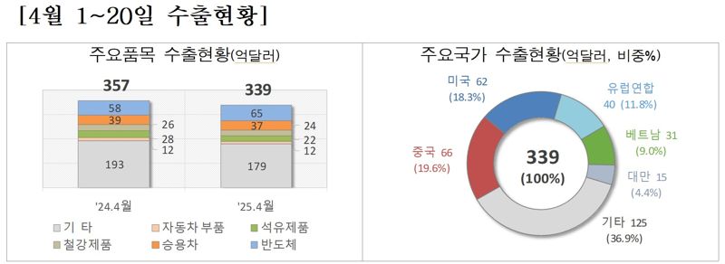 주요 수출품목별로는 반도체(10.7%)는 증가했지만, 승용차(-6.5%), 석유제품(-22.0%), 자동차부품(-1.7%)은 줄었다. 반도체 수출 비중은 19.1%로 2.8%p 증가했다.