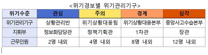 정보시스템의 위기징후가 감지되거나 위기 상황 변화에 따라 위기경보 수준 변경이 필요한 경우 자체적으로 상황판단회의를 개최해 위기수준에 따라 위기관리기구를 구성해 운영할 계획이다. 또한 올해 하반기 중 위기단계별 시나리오에 따라 모의훈련을 실시해 사전에 장애발생 대응 능력을 축적할 예정이다.