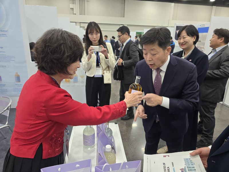 박정주 충남도 행정부지사(오른쪽)가 지난 17일 미국 애틀란타에서 열린 ‘2025 세계한인비즈니스대회’ 행사장에 마련된 충남지역 업체 부스를 찾아 제품 설명을 듣고 있다.