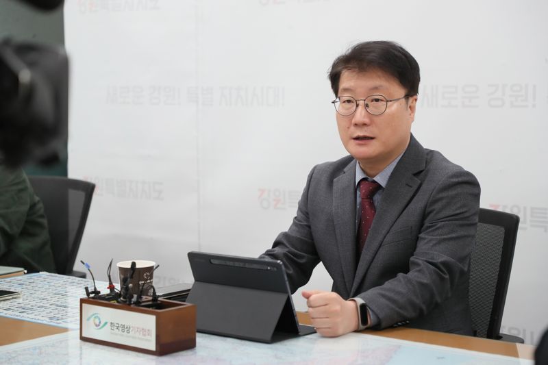 여중협 강원특별자치도 행정부지사가 21일 강원도청 기자실에서 도내 의료원 출연금 배분에 대해 설명하고 있다. 강원자치도 제공