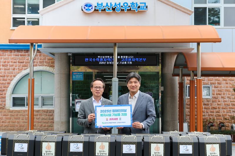 20일 '제45회 장애인의 날’을 기념해 남영규 고리원자력본부 대외협력처장(사왼쪽)이 부산성우학교를 찾아 후원물품을 기부했다. 고리원자력본부 제공