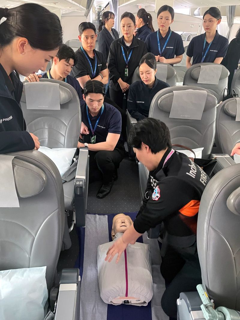 인천국제공항 내에 위치한 공항소방대 교육장에서는 에어프레미아 기내에 비치된 실제 소화기의 사용법 및 주의사항, 기내 특정 구역(오버헤드빈, 화장실, 오븐 등)에서의 화재 진압 방법, 리튬배터리 화재 대응법, 연기 발생 시 호흡기 보호 원리, 심폐소생술(CPR)과 부목 사용법 등 교육을 받았다.