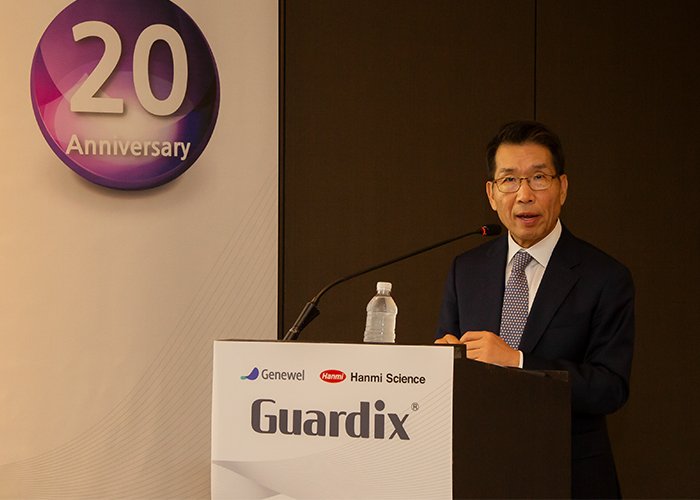 한상덕 제네웰 대표이사가 22일 서울 중구 더 플라자 호텔에서 열린 가딕스 출시 20주년 기자간담회에서 발언하고 있다. 동성케미컬 제공