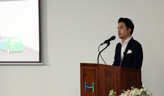 김익환 한세실업 부회장이 23일 대구 한세모빌리티 본사에서 열린 기업설명회에서 발언하고 있다. 한세예스24그룹 제공