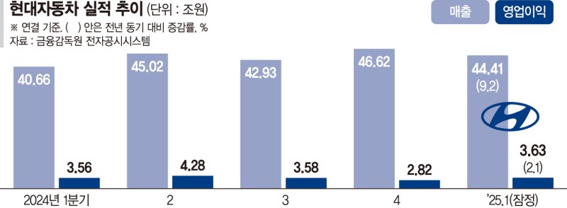 현대자동차가 올해 1·4분기에 역대 최대 매출액을 기록했다. 전 세계 자동차 판매 전년 대비 소폭 줄어든 가운데서도 현대차의 매출액과 영업이익이 나란히 증가했는데, 이는 우호적인 환율 여건과 더불어 비싼 차를 많이 판 영향으로 풀이된다. 특히 내연기관차 보다 값비싼 하이브리드차 등 친환경차 판매 비중이 높아진 것이 주효했다는 분석이다. 도널드 트럼프 행정부의 25% 자동차 품목관세 부과로 불확실성이 증폭되고 있는 것과 관련해선 비용절감과 효율화를 목표로 '컨틴전시 플랜(비상대응 계획)'을 수립해 대응하겠다고 밝혔다.