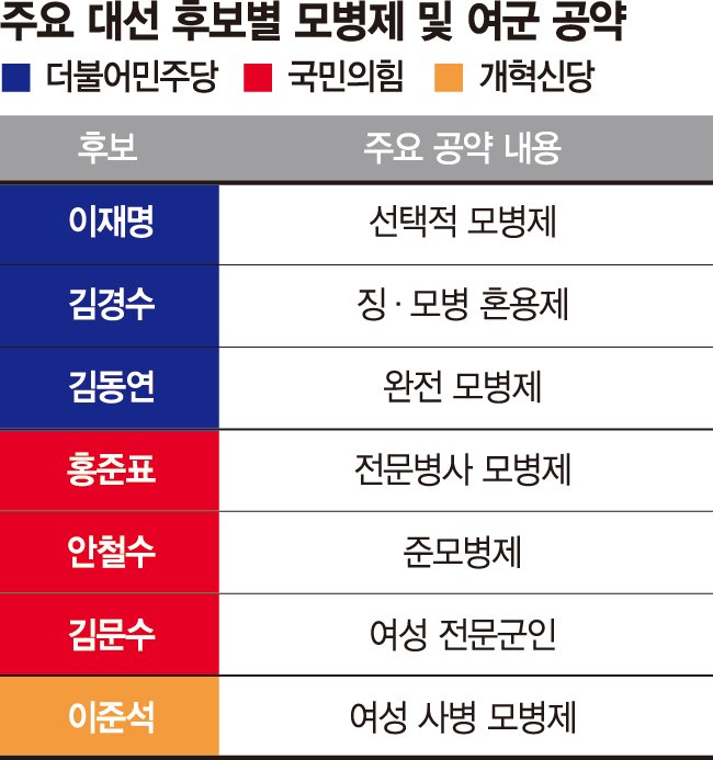 대선주자들은 남성 징병제 중심에서 벗어나 모병제 및 여군 확대를 통한 상비군 개편 공약을 쏟아 내고 있다. 인구 감소와 첨단 군 과학기술의 발전도 이같은 병력 체계 변화를 부추기고 있다. 그렇지만 병역제 개편 방식을 두고선 대권주자들간의 의견이 엇갈리고 있다.