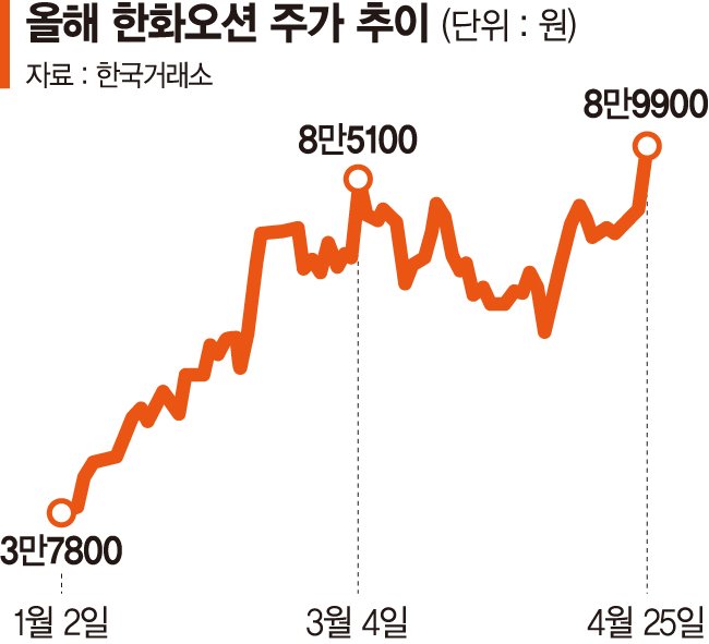 27일 한국거래소에 따르면 한화오션은 지난 25일 전 거래일 대비 11.12% 오른 8만9900원에 마감했다. HD한국조선해양과 HD현대중공업도 각각 6.01%, 7.18% 상승했다.