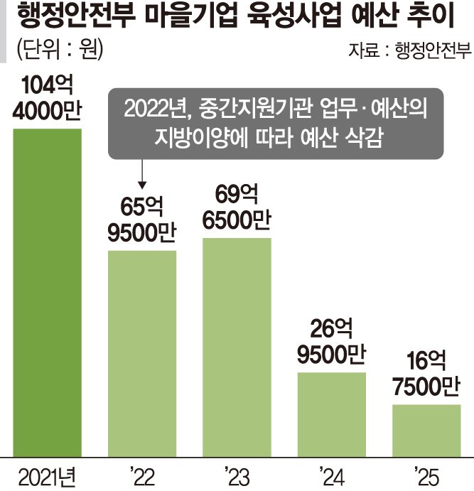 2021년에는 약 104억원이었던 지원 예산이 2024년에는 약 26억원으로 급감했으며, 2025년에는 신규 마을기업 지정이 재개됐지만 지원금 없이 지정만 이뤄지는 경우도 나타났다. 이는 정부가 보조금 지급보다는 홍보와 컨설팅 같은 간접 지원에 초점을 맞추는 방향으로 정책을 전환했기 때문으로 분석된다.