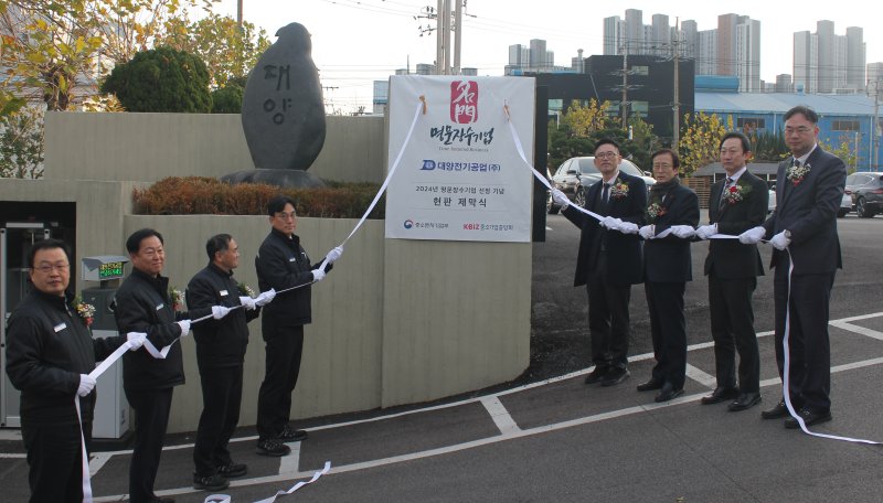 부산 사하구 대양전기공업㈜에서 부산지방중소벤처기업청과 중소벤처기업진흥공단 부산지역본부의 '대양전기공업 명문 장수기업 현판 제막식'이 열린 가운데 서영우 대양전기공업 대표, 강기성 부산중기청장, 이갑준 사하구청장, 중진공 조승민 부산본부장 등(왼쪽 네 번째부터) 참석자들이 기념촬영하고 있다. 부산지방중소벤처기업청 제공