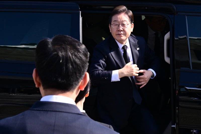 이재명 더불어민주당 대통령선거 후보가 28일 오전 서울 동작구 국립서울현충원에 현충탑 참배를 위해 하차하고 있다. (공동취재) 2025.4.28/뉴스1 ⓒ News1 이재명 기자 /사진=뉴스1