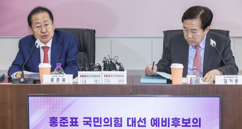 홍 후보는 이날 서울 영등포구 중소기업중앙회에서 중소기업계와의 간담회를 갖고 "그렇게 하지 않고는 중소기업의 지속성을 유지하기 어렵겠다(고 생각한다)"며 이처럼 밝혔다.