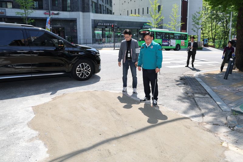 박강수 마포구청장이 지난 25일 발생한 대흥동 싱크홀 복구 완료 현장을 점검하고 있다. 마포구 제공