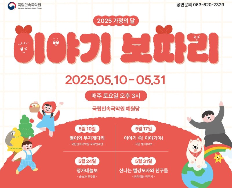 [파이낸셜뉴스] 국립민속국악원은 어린이를 위한 국악공연 '이야기보따리'를 오는 5월 10일부터 매주 토요일 총 4차례 무대에 올린다고 28일 밝혔다.