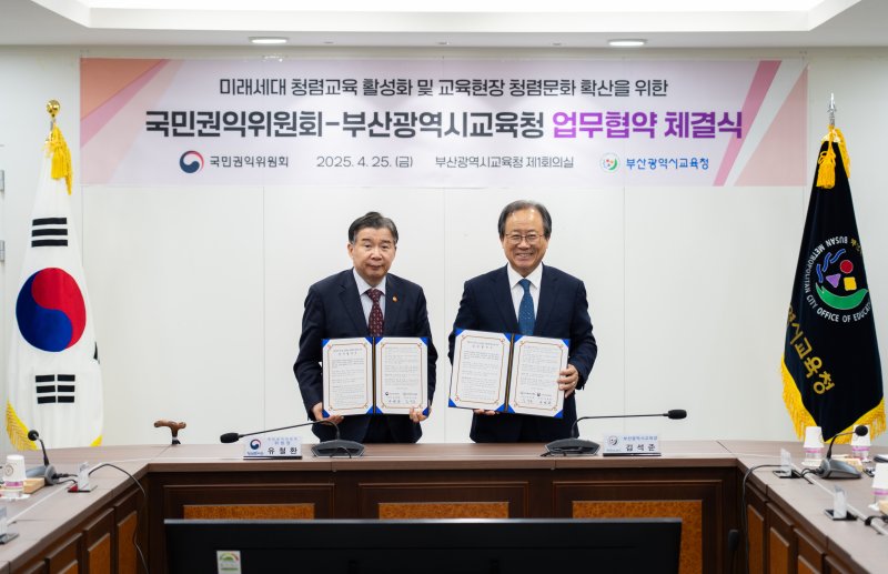부산시교육청은 지난 25일 시교육청 제1회의실에서 국민권익위원회와 청렴인재 양성과 교육현장 청렴문화 확산을 위한 업무협약(MOU)을 체결했다고 28일 밝혔다.