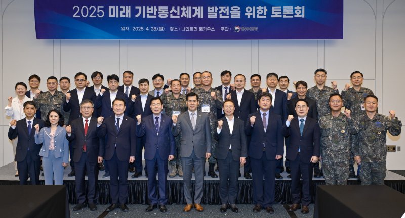 석종건 방위사업청장이 지난 28일 서울 용산구 로카우스에서 열린 '미래 기반통신체계 발전 토론회'에서 민·관·군 주요 참석자들과 기념 촬영하고 있다. 방위사업청 제공