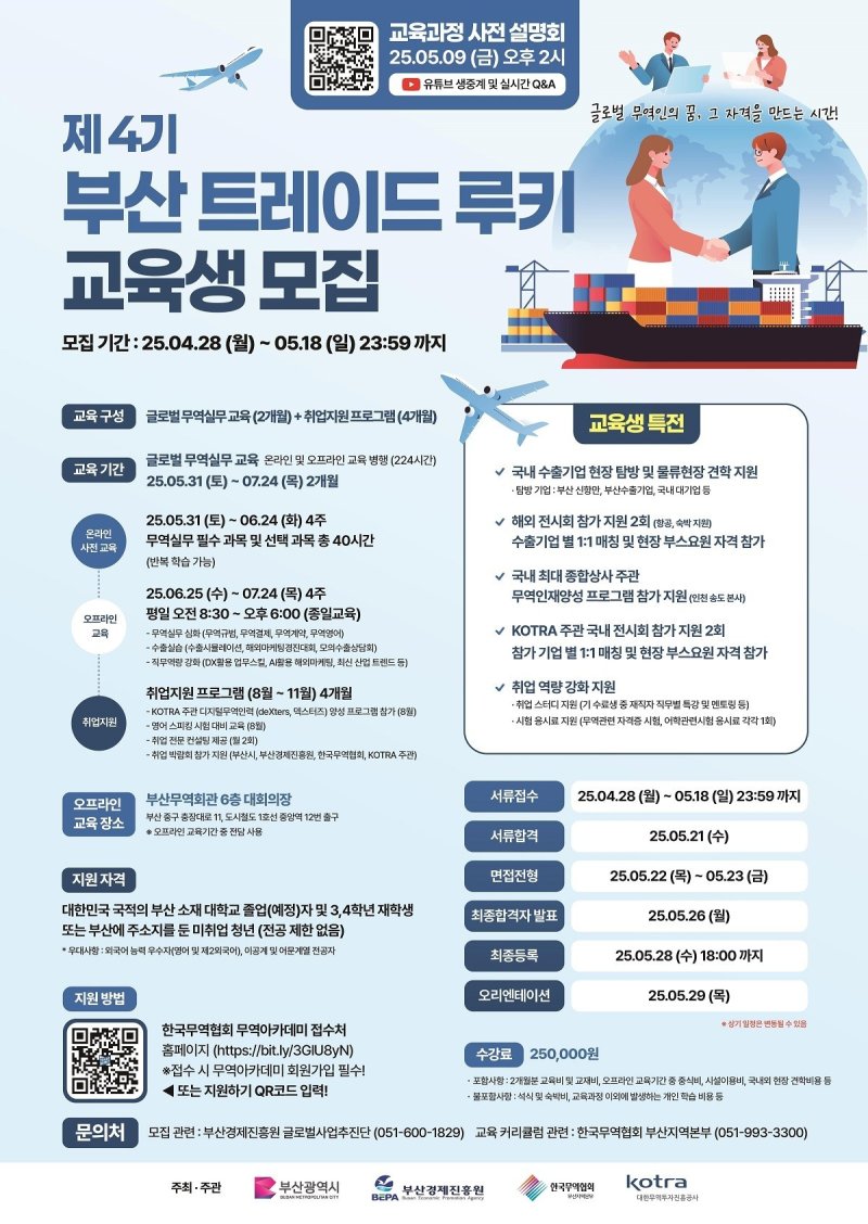 지원 자격은 부산 거주 미취업 상태인 청년과 대학교 3~4학년 재학생이다. 참가 희망자는 오는 5월 18일까지 한국무역협회 무역아카데미 누리집에서 지원서를 내려받아 신청하면 된다.