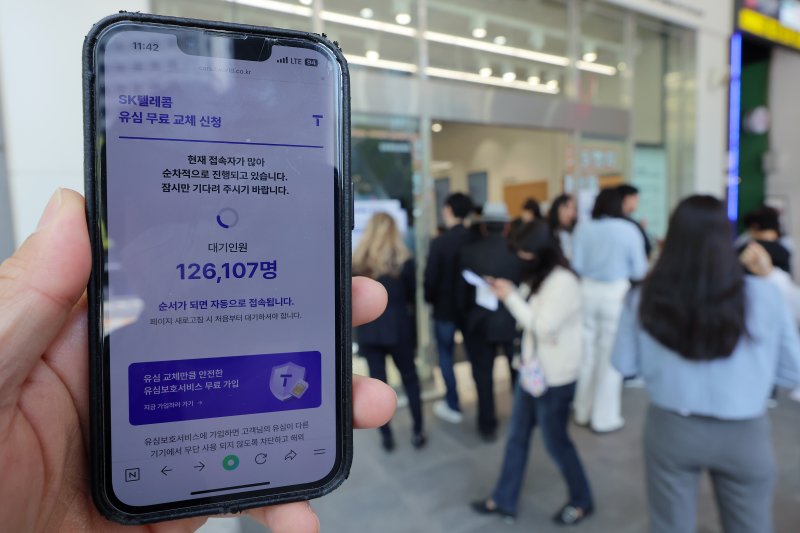해킹 공격으로 가입자 유심 정보가 탈취된 SK텔레콤이 가입자 유심 무상 교체를 시작한 28일 오전 서울 종로구 T월드 매장 앞에서 직원들의 안내를 받아 온라인 예약을 하고 있다. /사진=뉴스1