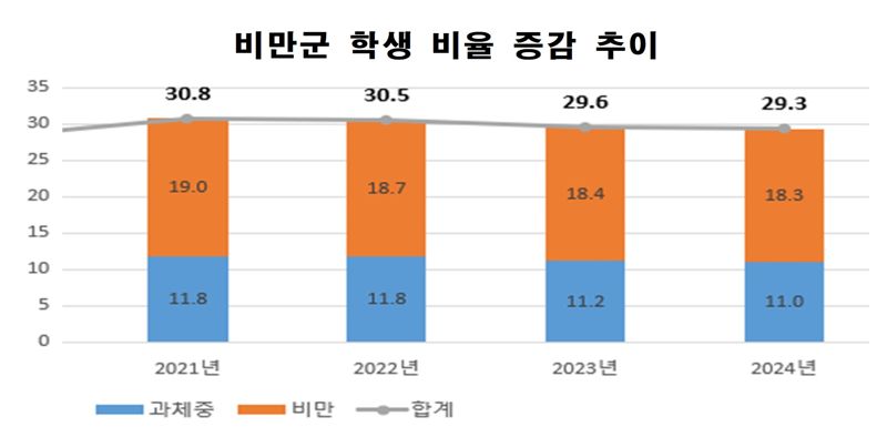 이 자료에 따르면, 과체중이나 비만에 해당하는 비만군 학생이 29.3%로 집계됐다. 비만군 학생은 2021년 30.8%에서 2022년 30.5%, 2023년 29.6% 등 최근 3년 연속 감소 추세에 있다.