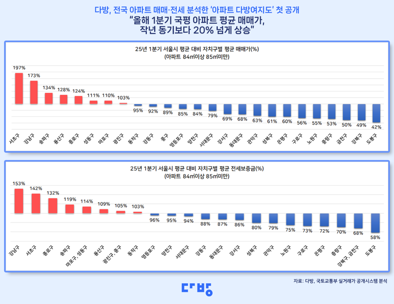 2025년 1~3월 서울 아파트 평균 매매가 및 전세가 상승. 다방 제공