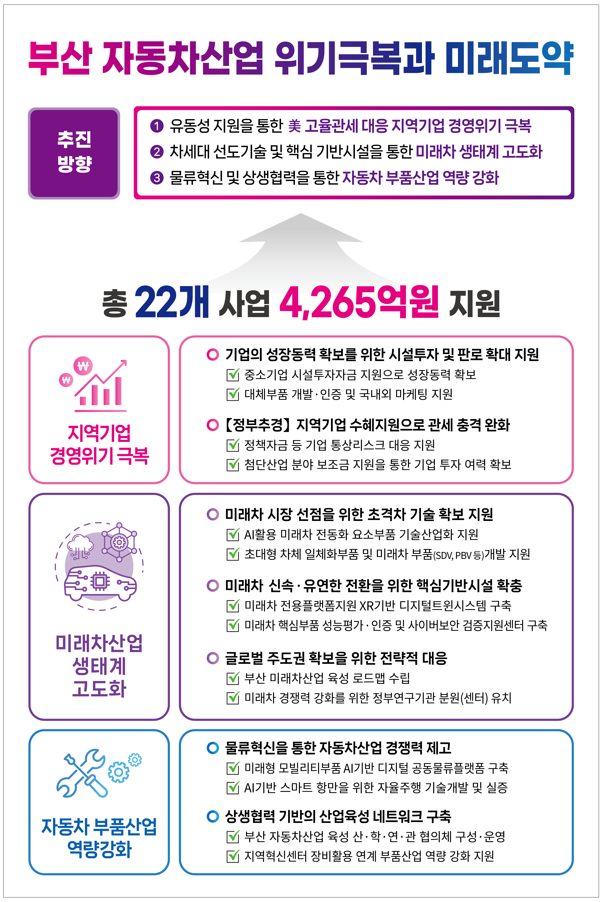 시는 총 4265억원 규모의 3대 전략, 7대 세부과제로 구성된 부산 자동차산업 위기 대응 전략을 수립해 본격 추진한다.