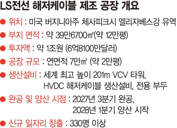 LS전선은 자회사 LS그린링크가 버지니아주 체사피크시에 미국 최대 규모의 해저케이블 제조 공장을 착공했다고 29일 밝혔다.