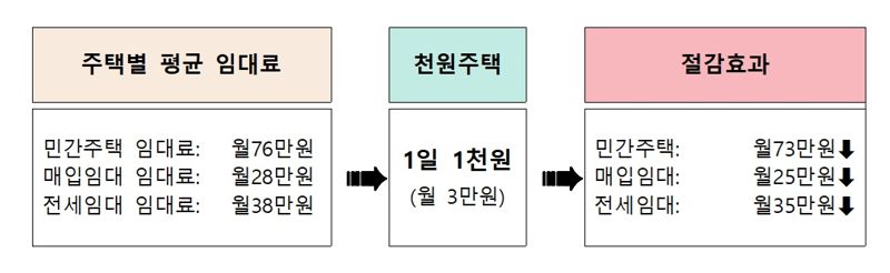 천원주택 전세임대주택은 입주 대상자로 선정된 신청자가 지원한도액 범위 내에서 전세주택을 직접 선택하면 인천도시공사가 해당 주택의 소유자와 전세계약을 체결하고 이를 입주대상자에게 하루 1000원(월 3만원)의 저렴한 임대료로 제공하는 인천형 주거복지 정책이다.