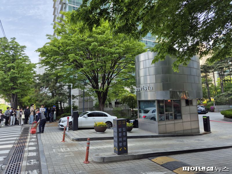 오전 10시경 아크로비스타 앞에는 경찰차량만 주차돼 있었고, 검찰 수사 차량은 외부에서 보이지 않았다. 아파트 경비원 역시 "수사관 차량이 들어온 줄도 몰랐다"고 전했다.