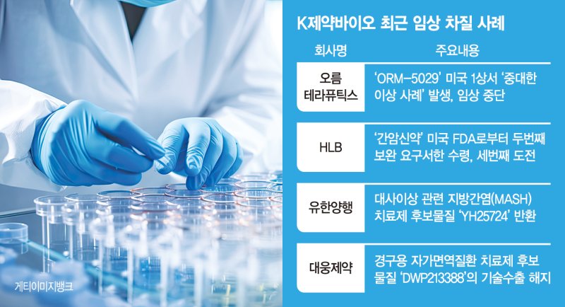 오름테라퓨틱스는 '항체접합분해제(DAC) 플랫폼'을 기반으로 개발하던 'ORM-5029'의 미국 임상에서 1명의 임상 참여자에게 중대한 이상사례(SAE)가 발생해 임상을 중단하기로 했다. HLB는 중국 항서제약과 리보세라닙·캄렐리주맙 병용 '간암신약'의 미국 식품의약국(FDA) 허가를 노리고 있지만 FDA로부터 두번째 보완요구서한(CRL)을 받으며 허가에 재도전, '삼수'에 나섰다.