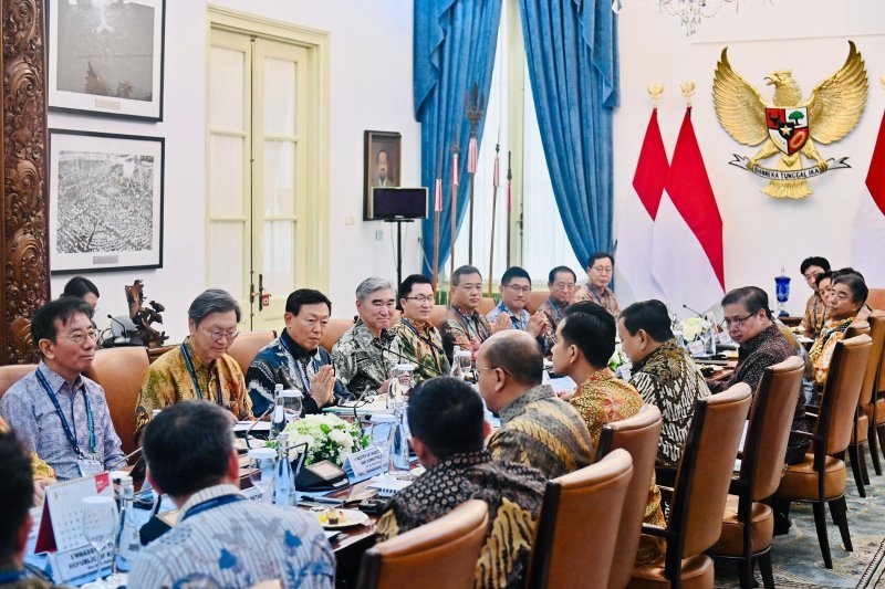 신동빈 롯데그룹 회장을 비롯한 한경협 경제사절단이 지난 달 28일 인도네시아 자카르타 메르데카 궁전에서 프라보워 수비안토 인도네시아 대통령을 예방하고 있다. (인도네시아 대통령실 제공)/사진=뉴스1화상