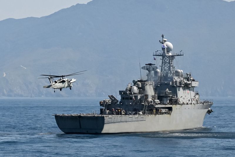 해군은 4월 28일부터 5월 1일까지 서해와 남해에서 압도적인 군사대비태세 확립과 필승의 전투의지 고양을 위해 함대종합전투훈련을 실시했다. 해군 해상기동헬기(UH-60)가 29일 합동 해양차단작전을 위해 원산함(MLS, 2600톤)에 접근하고 있다. 해군 제공