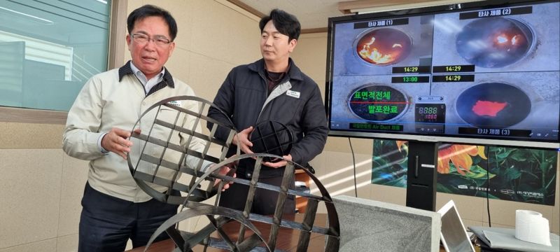 이종철 국일인토트 대표(왼쪽)가 자체 개발한 내화채움소재 '불스탑-AD' 성능에 관해 설명하고 있다. (주)국일인토트 제공