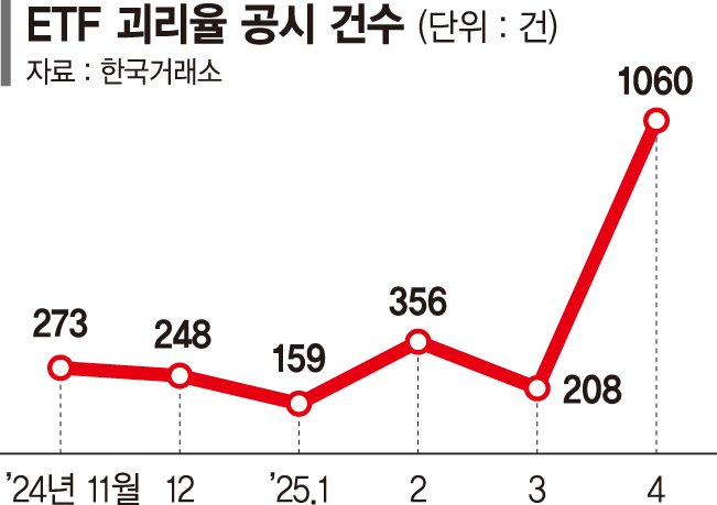 미국 관세 정책 영향에 따른 증시 변동성 확대로 괴리율이 급증한 국내 상장지수펀드(ETF)가 크게 늘고 있다.