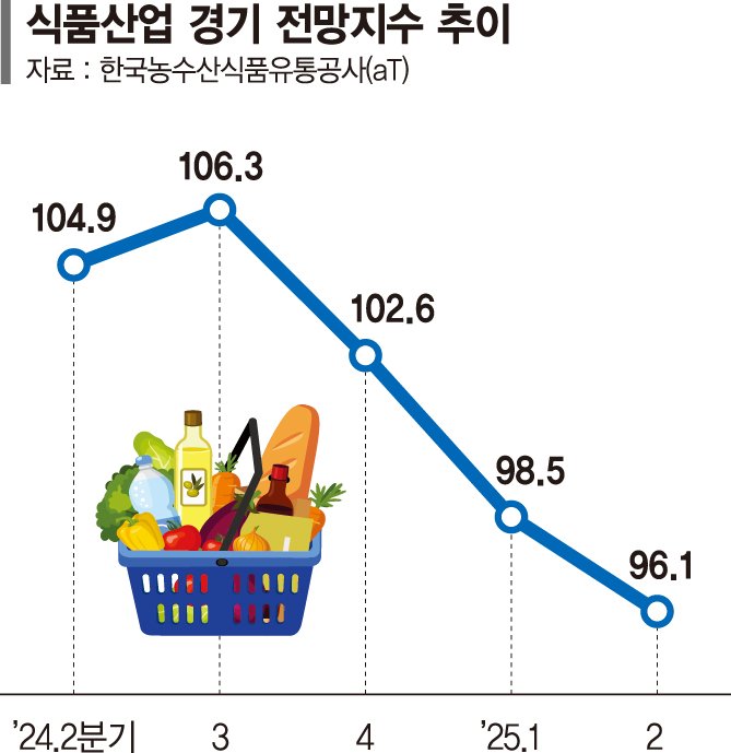 6일 한국농수산식품유통공사(aT)의 '식품산업 경기동향조사' 분석 결과에 따르면 올해 2·4분기 식품산업 경기 전망지수는 96.1로, 전분기(98.5) 대비 2.4p 감소했다. 2분기 연속 악화세다.