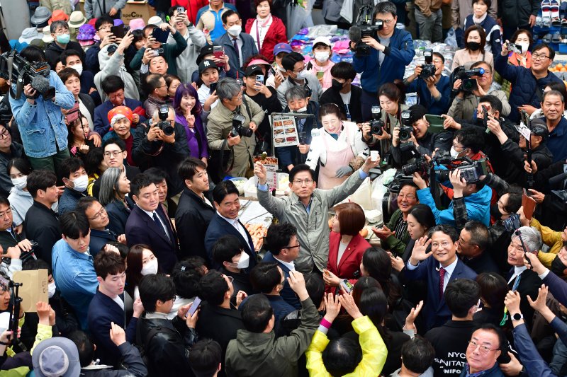 김문수 국민의힘 대통령 후보가 6일 경북 포항시 죽도시장에서 지지자들의 연호 속에 시장 투어를 하고 있다. 2025.5.6/뉴스1 ⓒ News1 최창호 기자 (서울=뉴스1) 박소은 기자 = 국민의힘 당 지도부와 김문수 국민의힘 대통령 후보가 6일 이른 아침부터 저녁까지 숨바꼭질식 갈등을 노출했다.